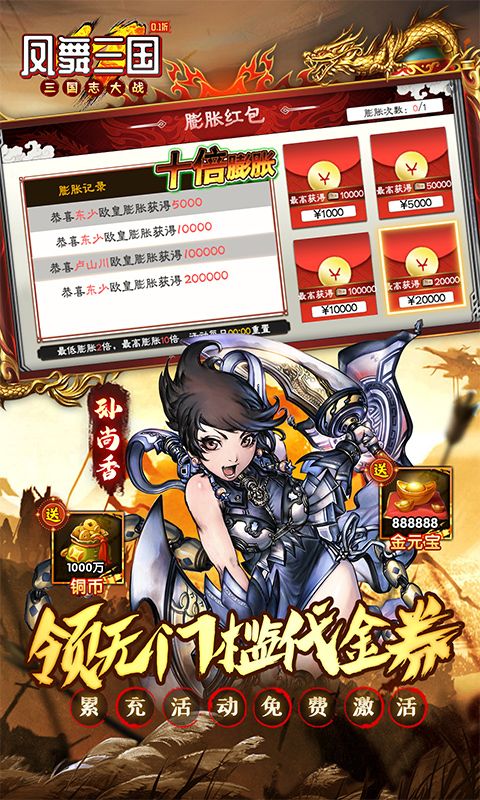 ★上线即送VIP10、888888金元宝、888888绑金、1000万铜币、限定0.1折专属称号、稀有将魂等海量资源,豪华资源轻松开局!