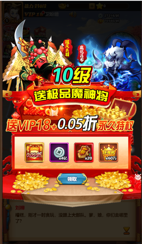 ★后缀说明:首充续充直购特权统统0.05折,星币红包有机会获得10倍星币,开服第2天开始每天免费领取2000星币,登录即送银币*4亿,至尊招将令*40、VIP经验*60万、1元激活卡*88