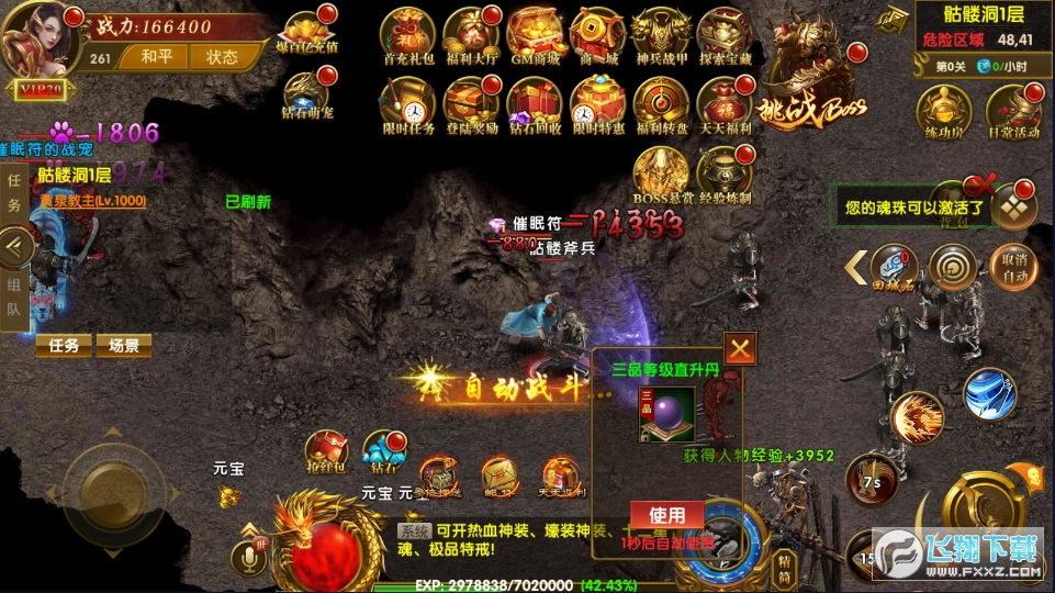 2、上线做完新手任务后,点击练功房,先把VIP奖励都领取完先,这个上线就可以直接领取,领完后可以用的道具都用掉,前面可以先挑战试练关卡,前面关卡还是比较容易通过,通过后可以自动挑战下一关,关卡越高,给的经验、元宝、血符和强化石就越多。