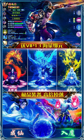《御龙传奇BT(仙魔重生)》是一款大型3D仙魔风格A手游。精致的美术画面通过炫酷3D效果,为玩家呈现了一个人魔大战的战场。新版本大优化,价值188元首充白给,VIP礼包白给,加入全局跑图+战斗3倍加速、掉落爆率10倍提升改动,并加入无限紫晶、海量元宝玩法,上线更有满级VIP13+88888绑元+888万金币,给你超爽体验,畅爽开局。配合精彩玩法供玩家探索,踏上君王之路。全自由化的PK对抗,极致激爽的战斗对决,将最大限度满足你对仙魔手游的所有幻想!