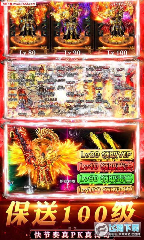 1、创角即送vip8,元宝*58888、金币*588万、60级极3武器+衣服、神器-刑天战神斩*1,逆天神器,暴力开局!2、超值充值比例1:1000,首充1:3000!首充送神甲-刑天战神甲,更有绝版称号等你来拿!3、免费月卡上线即送,助你快速升级!4、保送100级 畅爽升级,快节奏真PK真传奇!5、100倍爆率 装备全靠爆,满屏掉落的打宝快感