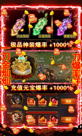 征与伐(爆百万充值)是一款全新的传奇手游,打boss爆充值卡能激活每天累充和福利累计充值! 开局免费送VIP15、百万元宝、金币*100000万,无限福利每日壕领不停!创角直升百级,日送百万元宝!BOSS爆率全部上调1000%,所有装备材料皆能爆!所有绝版酷炫时装免费抽,千倍返利嗨翻天!快邀请兄弟齐聚沙城,称霸全服!