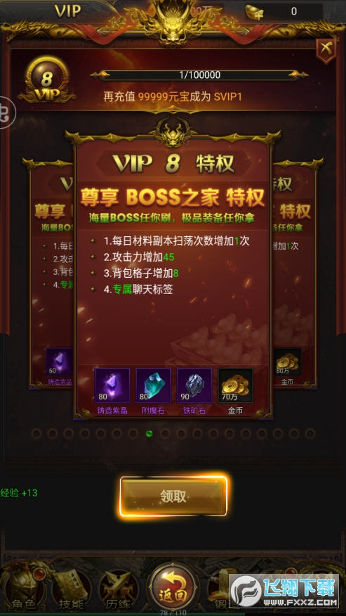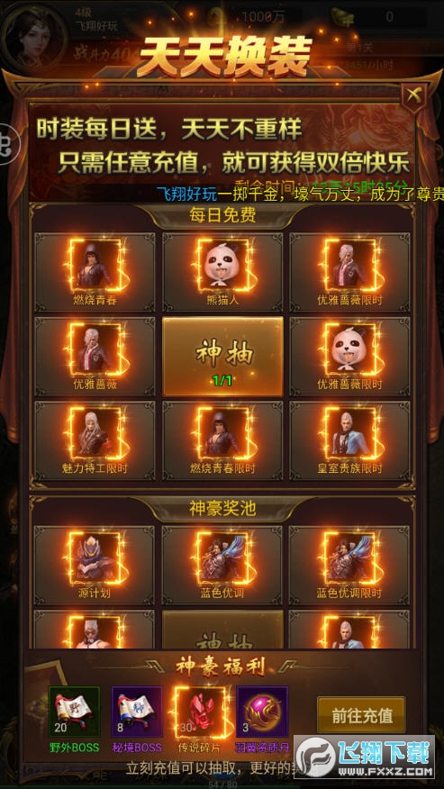 单日累充500元: 8转神装宝箱*7,龙魂精元*500,片羽*500,装备寻宝卷*200