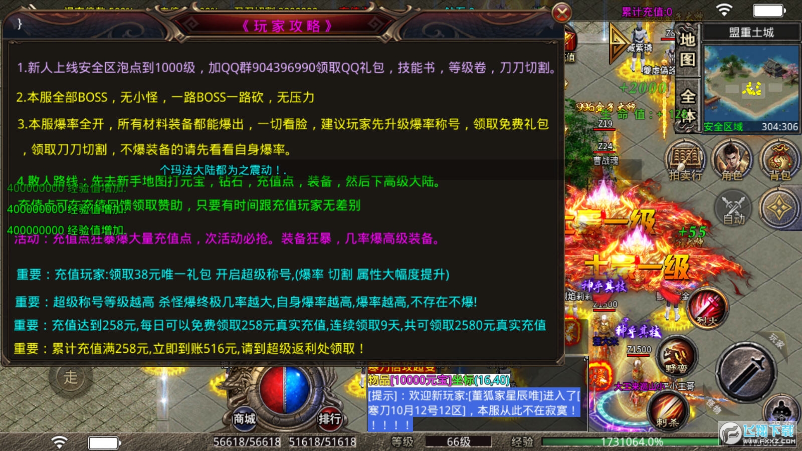 8.充值福利:累计充值500元起获得鞭尸几率、鞭尸爆率加成,累计充值越高加成越高;达到5000、20000分别获得月弧弯刀技能和30%爆率加成;