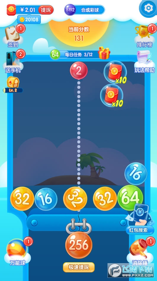 天气球球红包版是一款2048合成类游戏。全新升级,清新的游戏界面,不同于经典的2048的玩法模式,每个数字从屏幕上方掉落,数字相同则合成,也可以利用空间逻辑快速合成升级,有趣休闲。