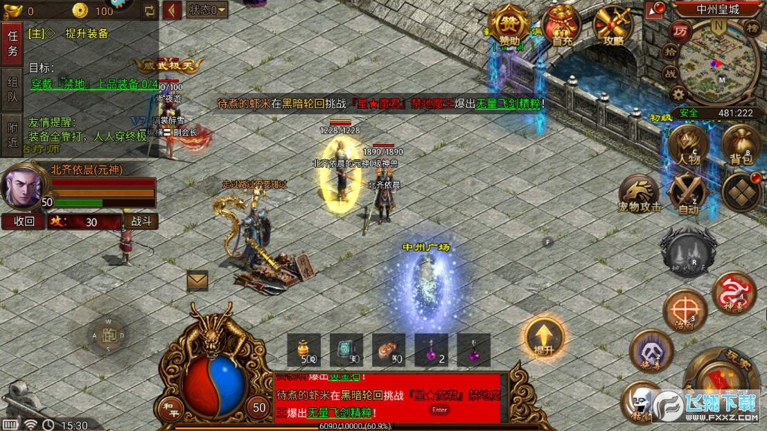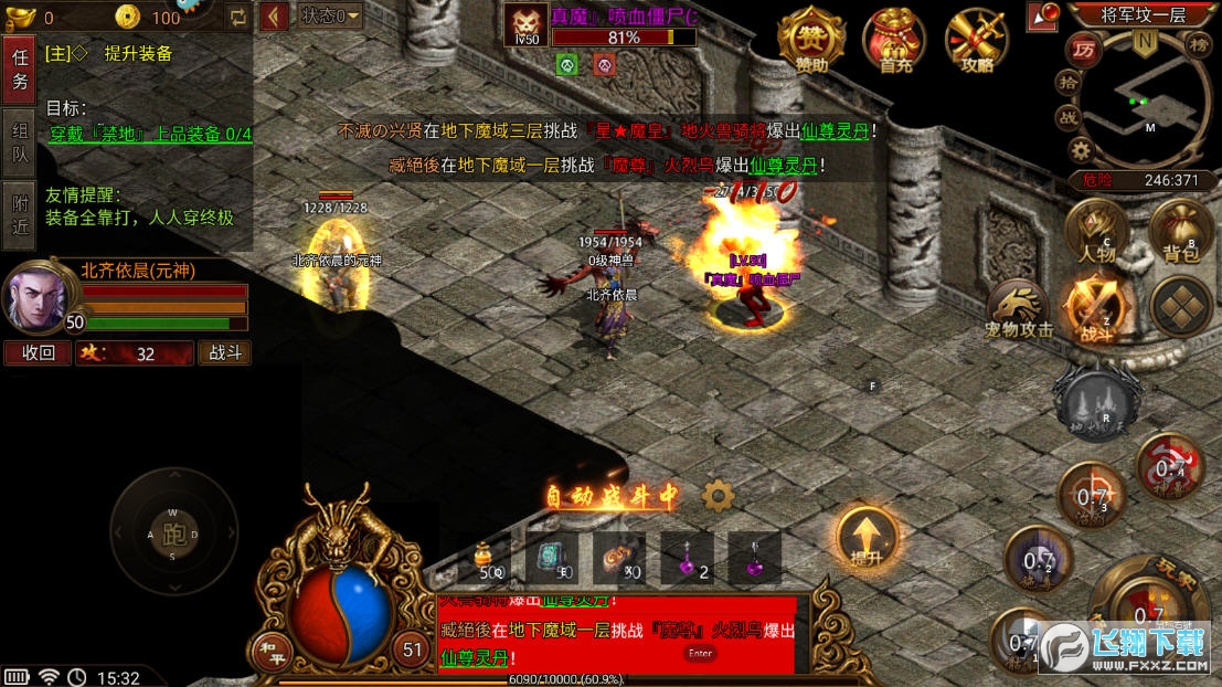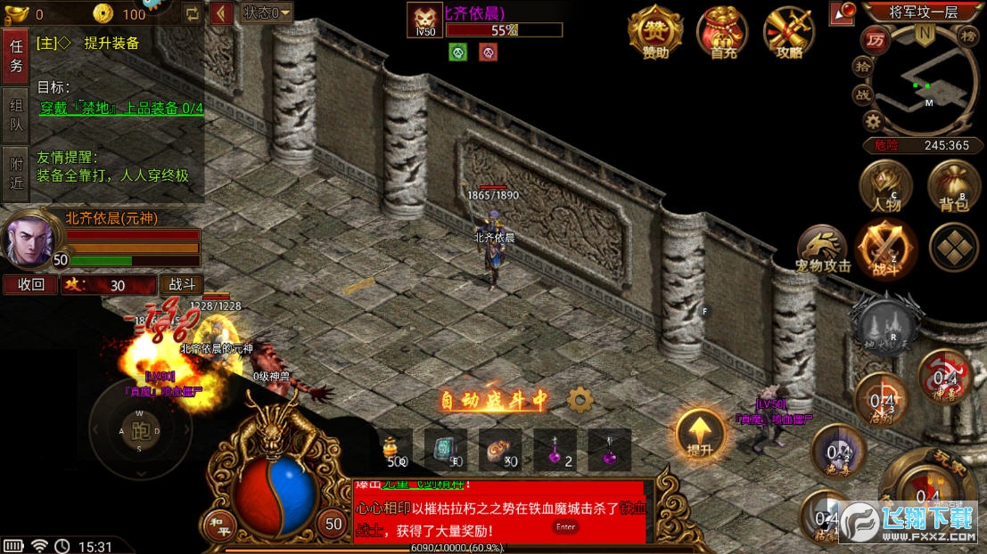3、学习威力强大的合击神技,通过不断完成任务、击杀怪物等手段获得材料和装备不断提升自己和元神的实力。