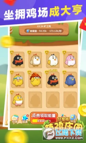 拖动即可合成萌鸡,每一只鸡都能产生收益!萌鸡的等级越高,金币和能量增长越快,产生的收益也就越高,还有每日分红等你来拿!