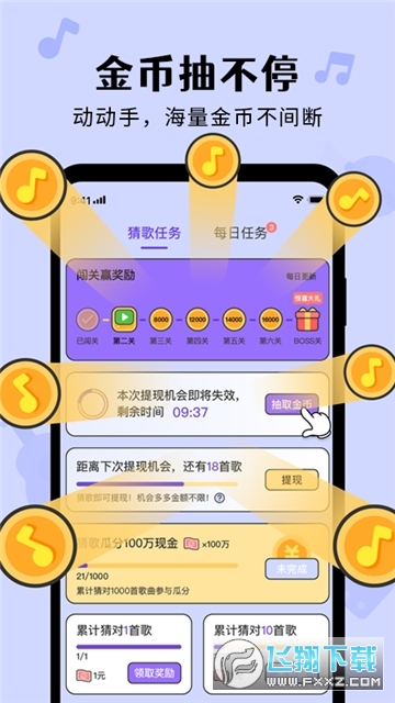 b、欢迎每天来这里签到猜歌,超多金币让你根据不同的任务来获取,方式多;