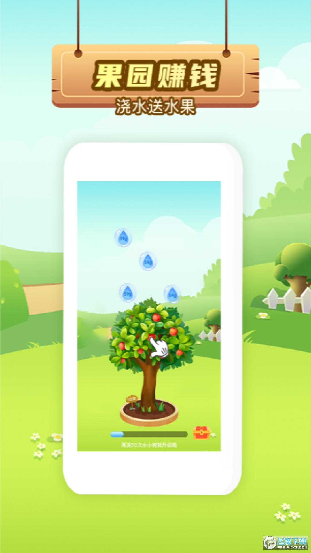 水滴,浇灌数目,产生苹果,兑换红包奖励。