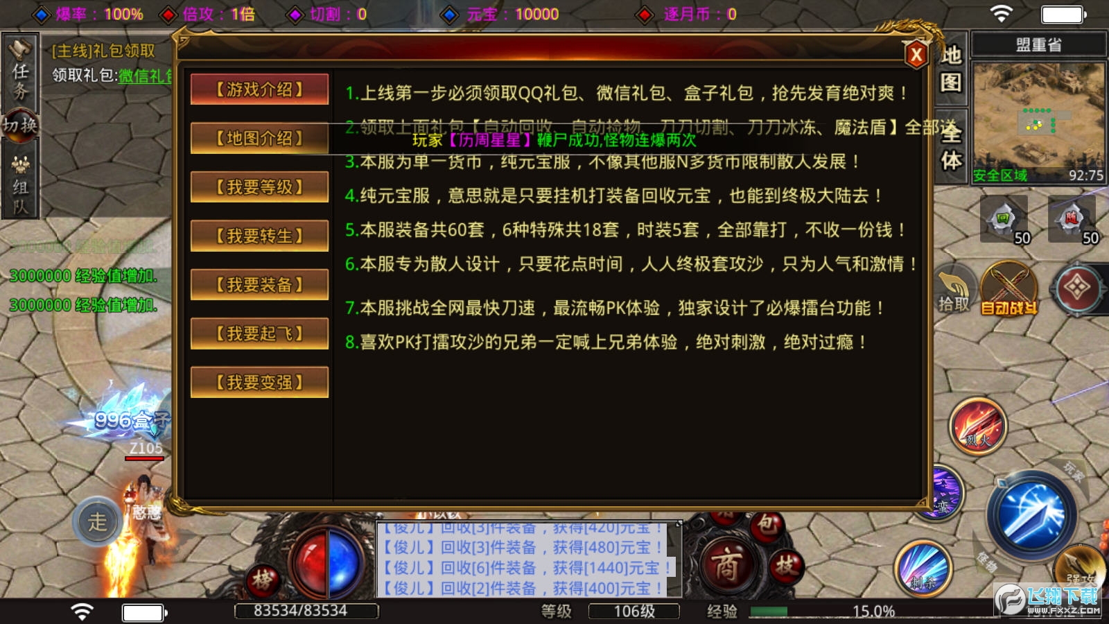 2、无需复杂操作,可以尽情的体验轻松打怪升级,装备买秒回收,超强新技能等你自由体验!