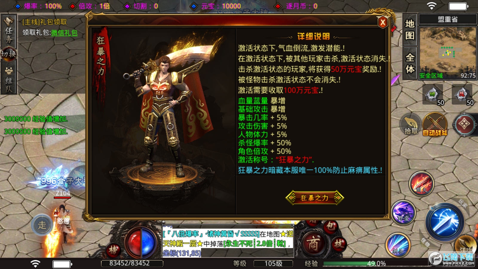 全屏光柱非常的热血,秒杀各种小怪,极品装备和稀有装备等着你来领取。