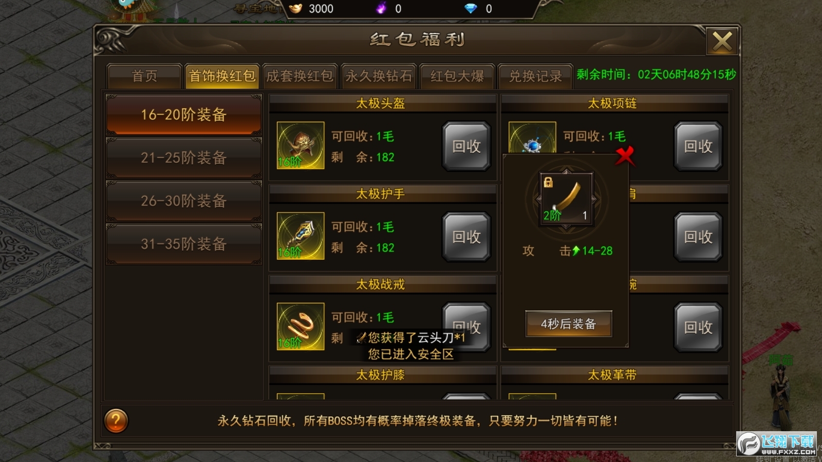 黄金特权每日可获得三次保底爆装福利,击杀妖将级以上boss必掉一件高阶装备,使用幸运药水还可以额外增加次数哦。