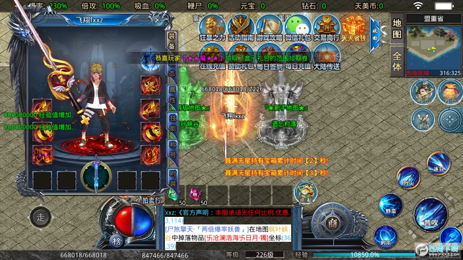 任意装备均可免费自动回收大量元宝,优先升级转生、称号、时装、速攻盾牌,多余的元宝可沙捐获得额外人物属性,进入专属地图。