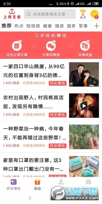 1、一款实时更新热门文章的阅读应用,用户们转发文章到自己的朋友圈,就能躺着收钱了;