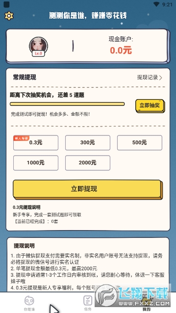 4.0.3元提现是新人专享福利,每个账号可享受一次5.如发现作弊、外挂等违规手段获取奖励,测测你是谁有权判定获得奖励无效