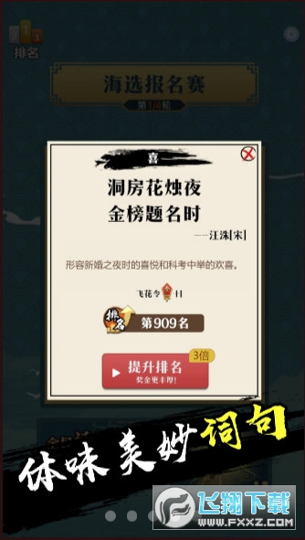 从海选赛一路battle,层层闯关最终进入全国总决赛,难度也会层层追加,上万首诗词等你来挑战。