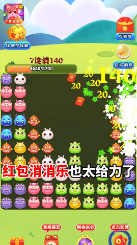 《红包消消乐极速版》是一款以休闲闯关的消除游戏,你将要在这探索更加神秘的森林世界,运用你的智慧和谋略去消除更多的障碍,海量的游戏关卡在这等着你,碎片化的游戏感受让人在闲暇时间也能痛快的爽一把,随时随地打开游戏玩一会。