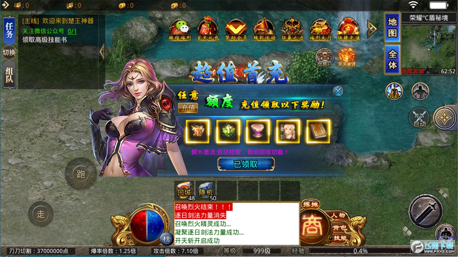 1.充值任意金额,领取首冲技能,半月群体切割怪物。