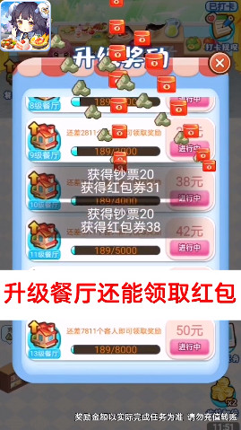 1、升级餐厅规模设施来吸引更多食客,赚取收益升级餐厅获取红包奖励。