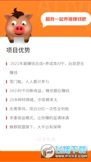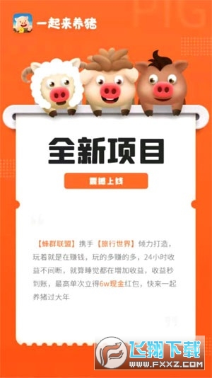 一起来养猪APP是由蜂群联盟携手旅行世界2021年倾力打造的一款合成+养成类赚钱游戏,玩着就是在赚钱,玩的多赚的多,24小时收益不间断,就算睡觉都在增加收益,收益秒到账,最高单次立得6W现金红包,赶快来下载一起来养猪APP养猪过大年吧!