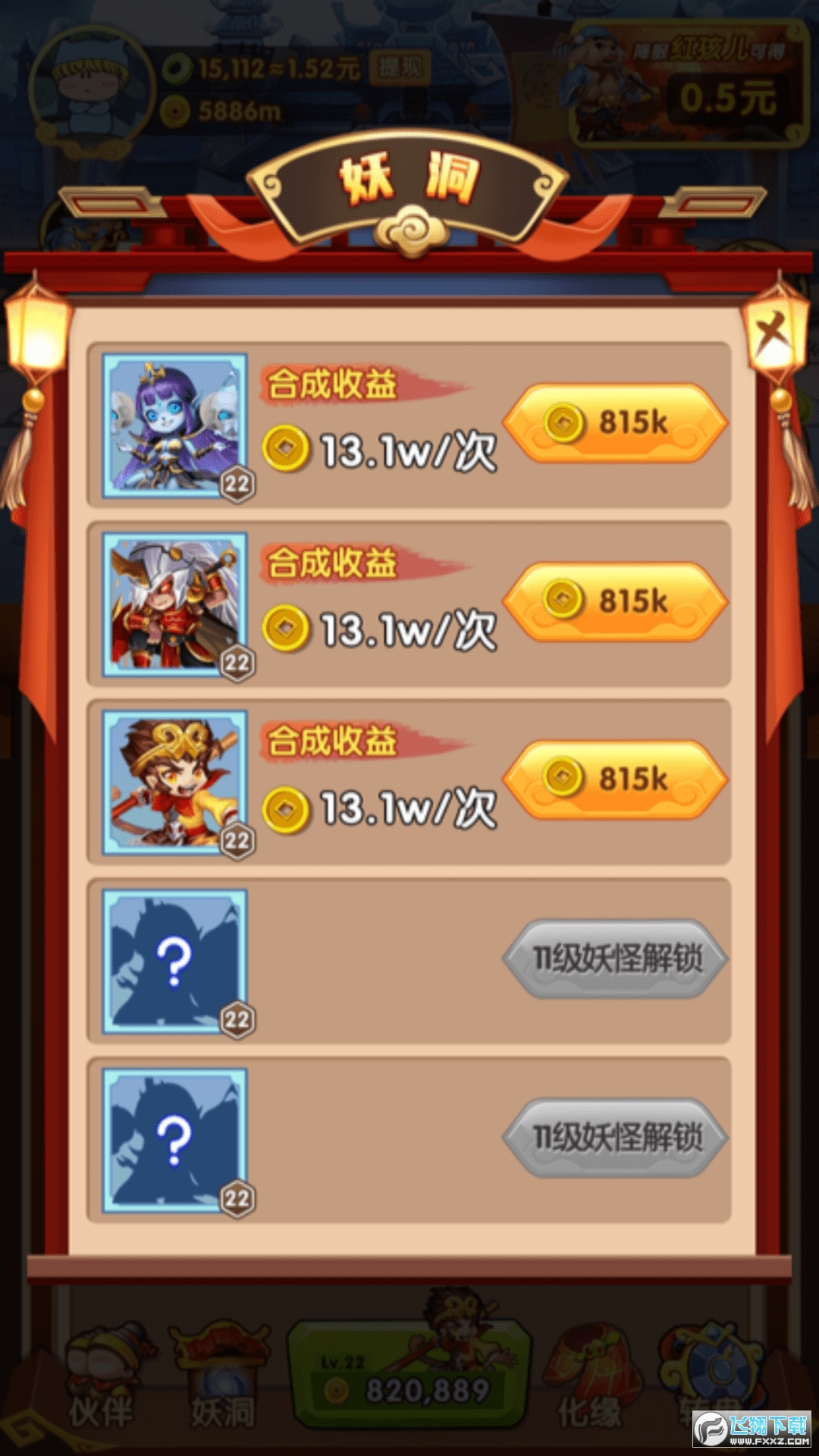 鸿运西游红包版是一款经典的合成游戏,不过这次是合成大圣齐天,你可以找到很多孙大圣,然后把猴子们合成起来,最后合成超级无敌美猴王,鸿运西游通过爽快的点击战斗和千变万化的妖魔设计,给玩家带来不同的西游战斗体验。