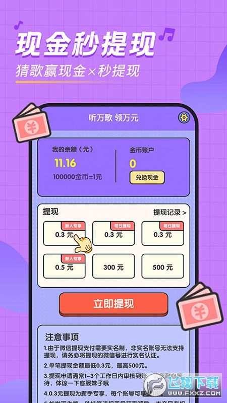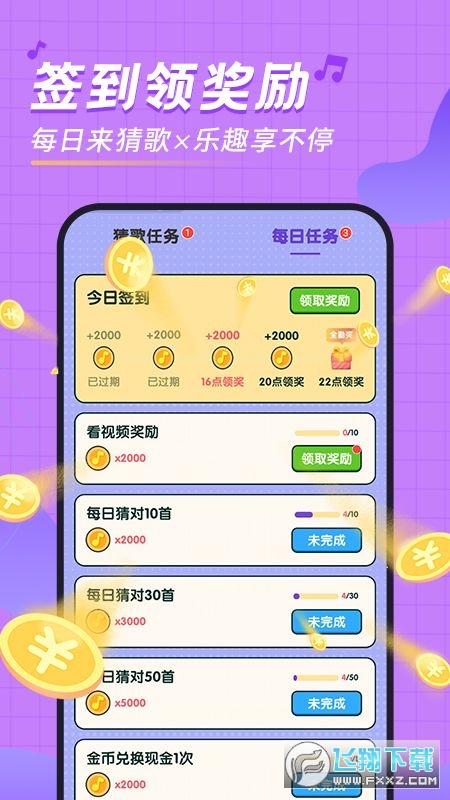 完成各种任务,能够获得金币奖励,查看每日的任务进行赚钱,满足用户针对音乐的爱好,同时一边完成各种游戏任务能够提现。