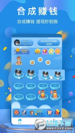 1、新用户下载注册养狗达人app即送获得一个大红包,通过合成升级养狗就能获得现金奖励和限时分红犬