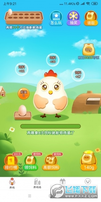欢乐养鸡场APP一款类的赚钱小游戏,玩家可通过气泡、转盘、定时奖励、任务等都可以获得饲料奖励,得到的饲料可以给小鸡喂食,喂食一定的次数就可以领取鸡蛋和现金,红包最高50元,鸡蛋可兑换现金或兑换新鲜土鸡蛋直接包邮到家。