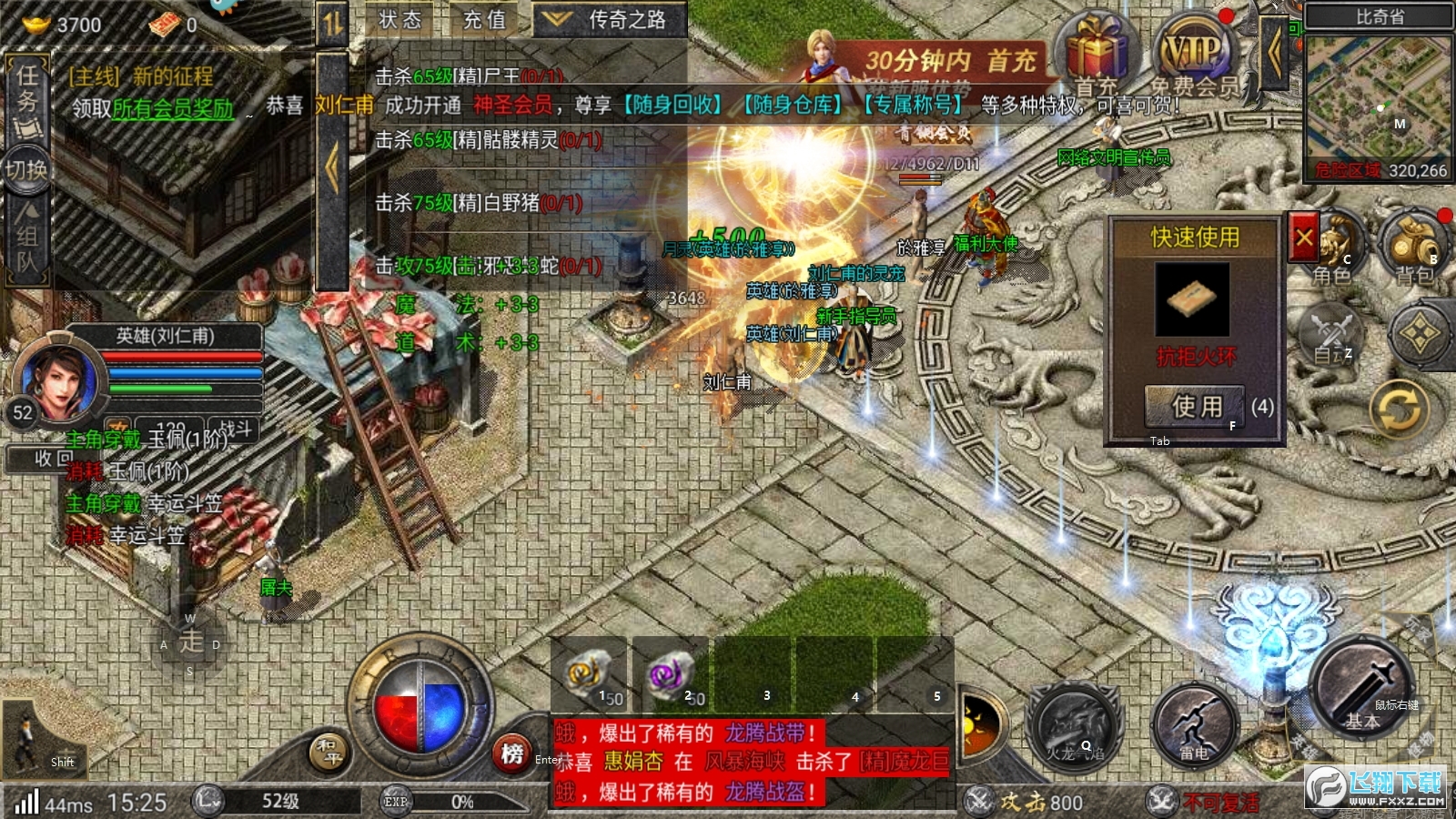 3.玩家仅需首充后,就可获得3整件无级别神装,战力飙升,当到达VIP3时,更可获得3件80级神装武器。