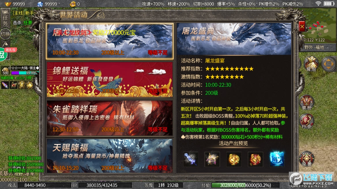 1、游戏升级速度快,杀死boss的掉落率高,屠龙在暴击中被捕获,增加了人物的属性战斗能力。