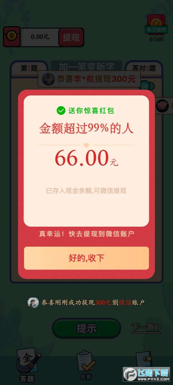 3、汉字红包,挑战汉字关卡成功后赠送红包奖励,得到的现金可直接提现。