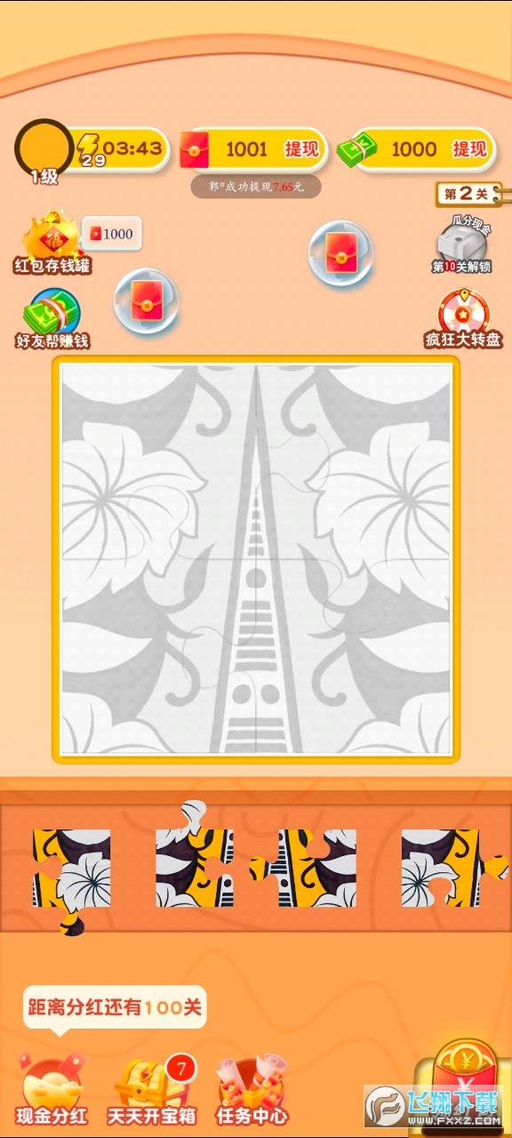 3、可以通过拼图来获取红包,拼接的关卡越多红包赚钱也是越轻松哦。