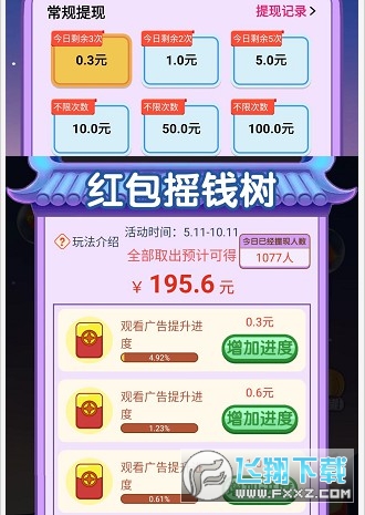 趣味成语大接龙,点秦今天新推的版本,玩法上有一点改变,另外奖励方面好像也改了。原来新人是前三关给大红包,现在只有第一题给大红包,我第一个视频拿到了4000多奖励。答题闯关需要消耗一些体力,我正常玩的奖励只有290左右。新版本新增了一个红包摇钱树玩法,看视频时额外得到进度奖励,够100%进度可提。
