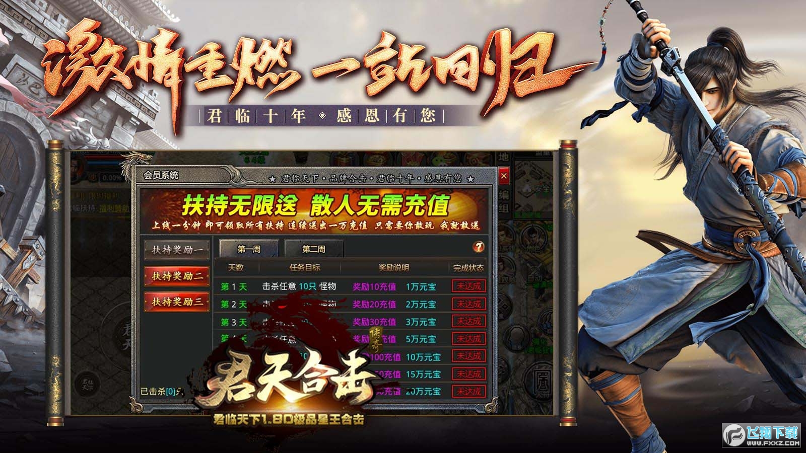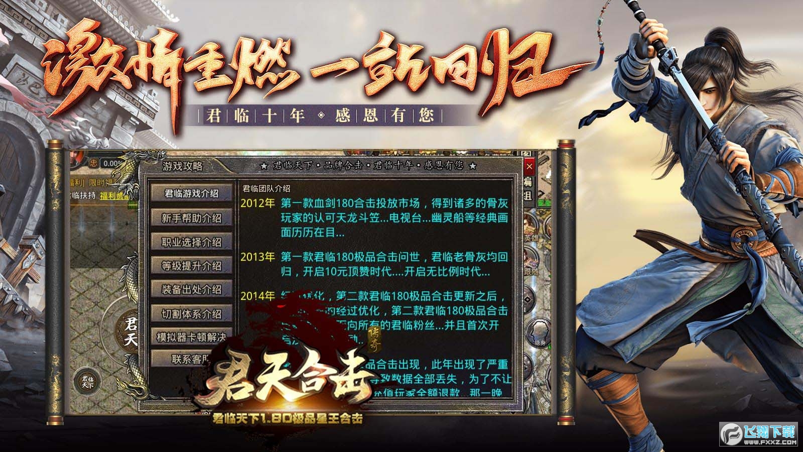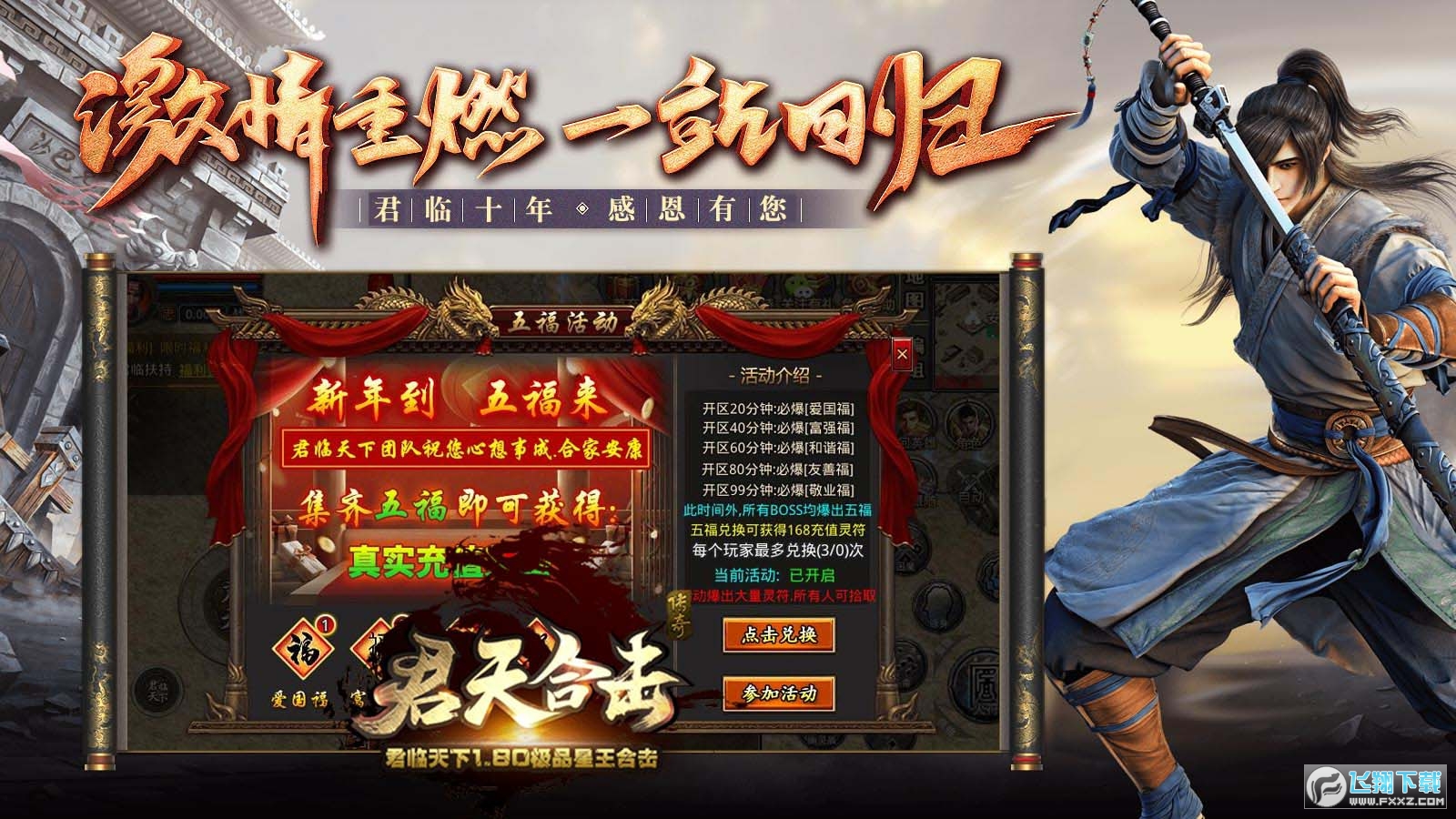 君天1.80极品星王合击,由原端游《君临天下》团队匠心巨制,本游戏延续端游《君临天下合击》经典玩法,装备靠打、武器靠喝、低消耗、对版本进行全新精装改版完善优化。融入多元素、多玩法且三端互通。三职业平衡,万人在线,骨灰玩家推荐,本服无充值回馈地图,一切看脸,脸白爆一切!保证长久,稳定,信誉!
