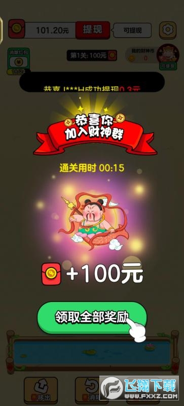 年年有鱼游戏是真的,新人通过第一关后能获得100元红包奖励,可惜的是并不能直接兑换出来。观看任意广告可以获得“财神币”10000个金币=1元。当然如果闯关的数量越多,金币的价值也越高,闯关数达到30关,1万金币=100元,是最高奖励了,财神币奖励满0.3元可以提现。