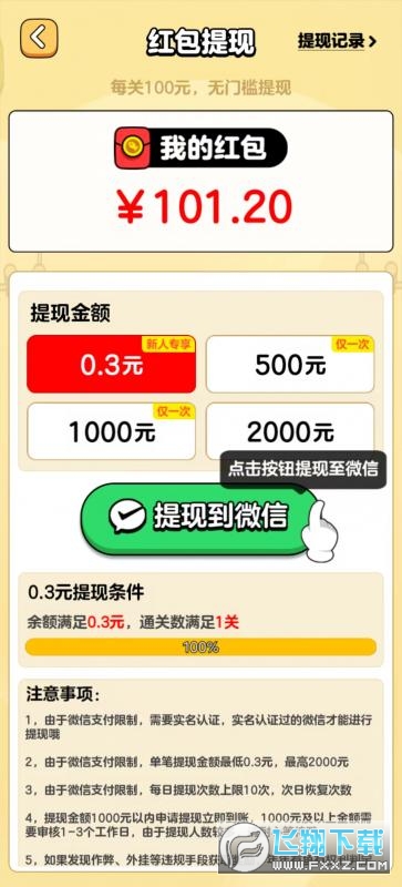 年年有鱼客服:通过第一关后即可提现0.3元红包,500元不可以提现,是因为需要通过第6关,并且累计消除10000个福袋,才可以申请兑换500元红包。