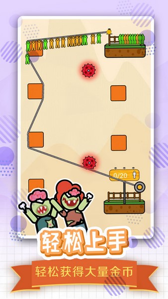 全民绳索营救是一款手指控制的物理解谜休闲游戏,经典的物理闯关游戏魔性剧情设定,多样不同的关卡场景设计挑战十足。玩家通过手指画线来绘制绳索,将起点和终点连接起来躲避各种各样的障碍成功解救被困人员。