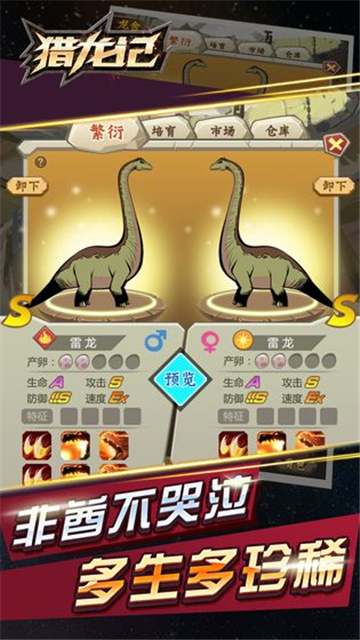 猎龙记是一款恐龙题材的休闲闯关类游戏。精致细腻的游戏画面,精彩的玩法内容,让你享受真实的冒险体验,各种各样庞大的恐龙给你带来震撼的视觉效果,你需要对它们进行很好的培养,让它们可以帮助你战胜更多强大的对手,每个恐龙的技能都不相同,你需要合理的进行搭配,充分发挥它们最强的战斗实力。