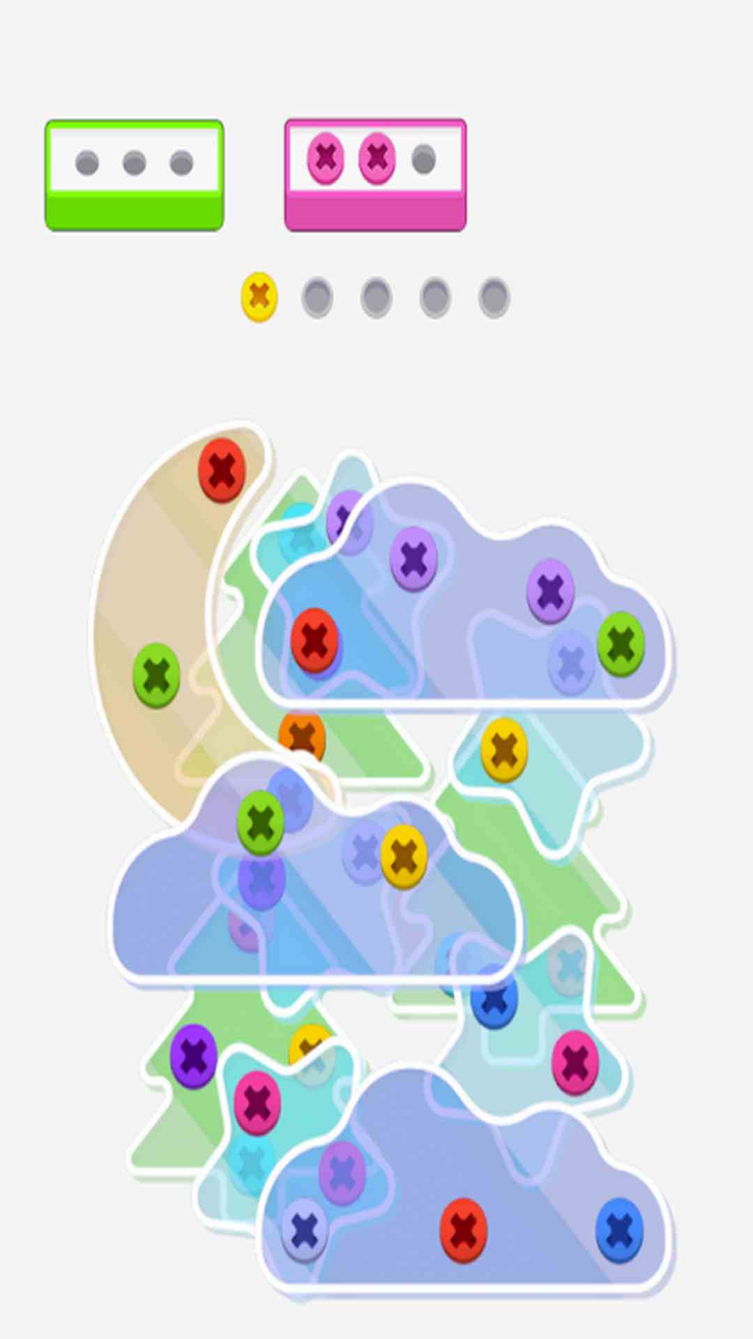 3、轻触松开相同颜色螺丝,打到正确位置合并同类,以巧妙拆解透明板重叠迷局~