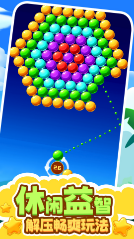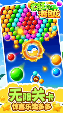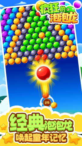 疯狂的泡泡龙是一款休闲益智类的射击消除游戏,玩家通关点击手机屏幕调整炮台角度发射泡泡,射出的泡泡与被射击的泡泡颜色相同,且有3个以上就可以消除,玩家可以直接射击,也可以利用两边的墙壁找角度反弹,消除玩所有泡泡就可以通关啦!它不仅适合各个年龄段的玩家,而且无论是在上下班通勤,还是躺在沙发上闲暇时光,都能轻松畅玩。