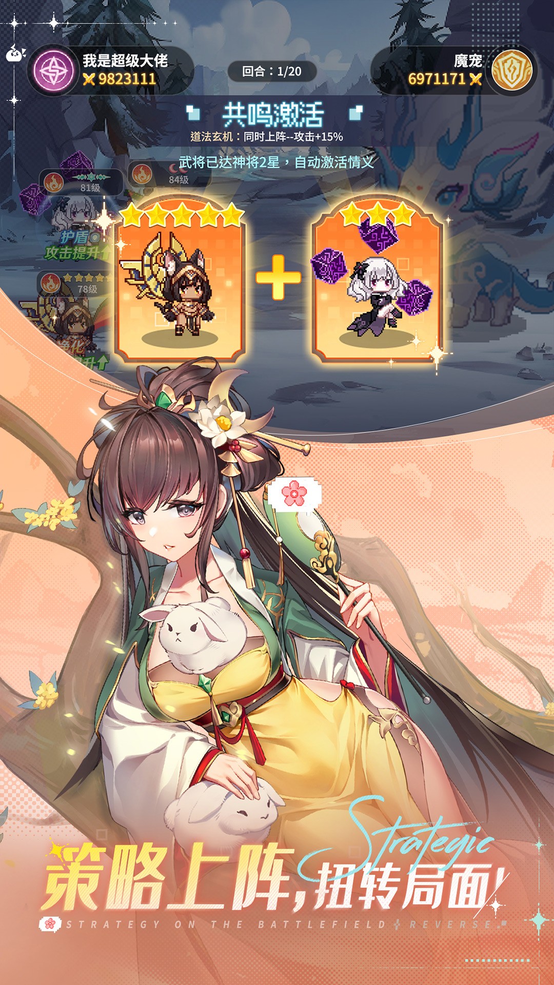 1、策略布阵扭转战场,合理阵型提供巨大属性加成。