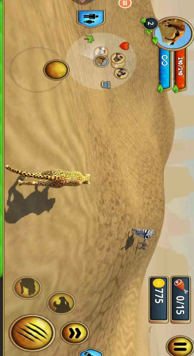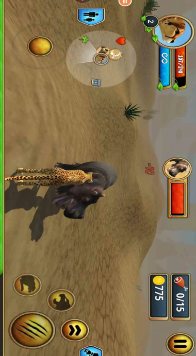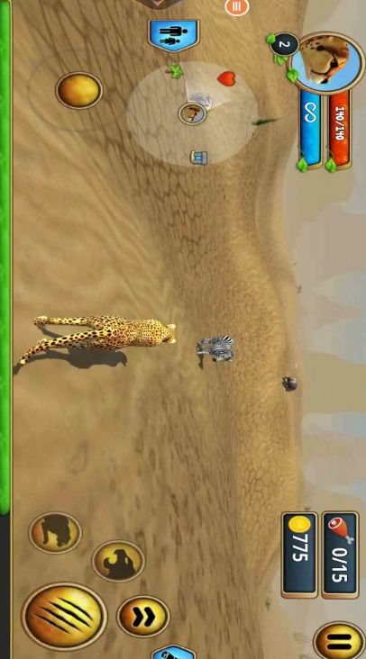 1、游戏模拟了猎豹的生命值、饥饿值、口渴值等。玩家可以控制猎豹进行奔跑、跳跃、咆哮和攻击等动作。