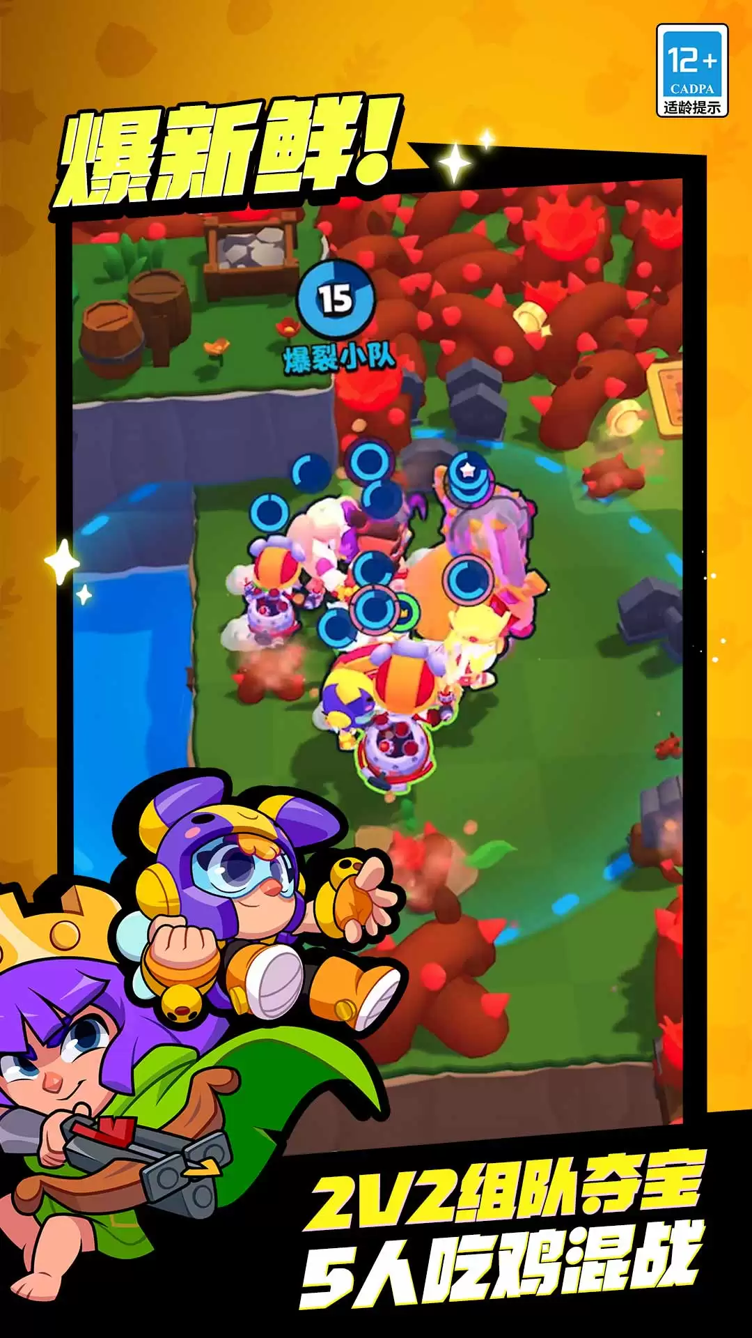 和一个朋友组队对抗其它三个队伍。收集到最多宝石的队伍获胜。获胜队伍分享战利品,失败也能得到。有任务、表情、皮肤、5v5、排名模式。所有角色都有特殊技能。