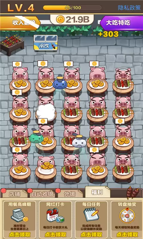 1、不断提升客户用餐速度和平均烧烤价格,帮助您快速赚取更多金币。