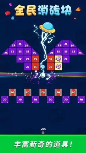 1、全民消砖块无限钻石游戏中除了特殊的砖块外,还有可以积极使用的道具,可以灵活使用,突破这些关卡。