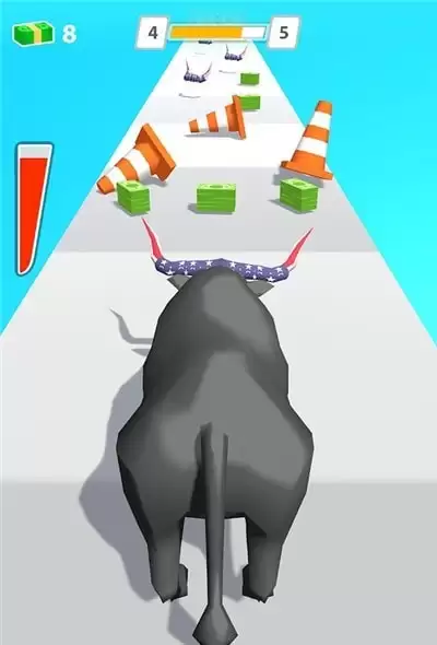 4、公牛大师奔跑控制公牛向前跑,左右移动,收集路上的牛角。