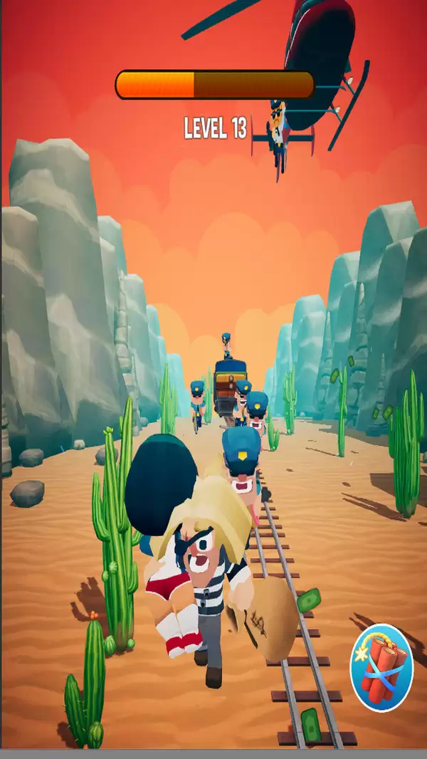 强盗跑酷是非常有意思的跑酷游戏刺激过瘾,游戏中你将扮演强盗,逃脱警察的追捕,在途中你要掳走好看的女人,警察在后面追赶你,警察有直升机支援你需要躲避警察的射击和直升机的射击,从而完成闯关游戏中有很多的道具供你使用。