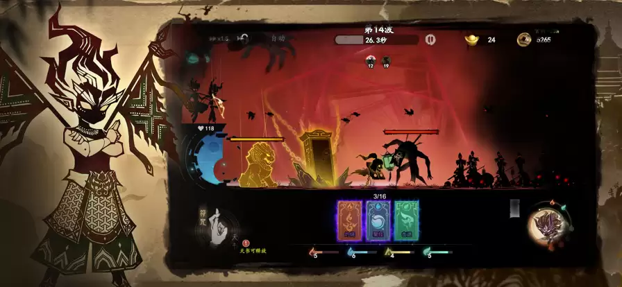 2、游戏采用横版策略塔防玩法,角色会自动战斗。